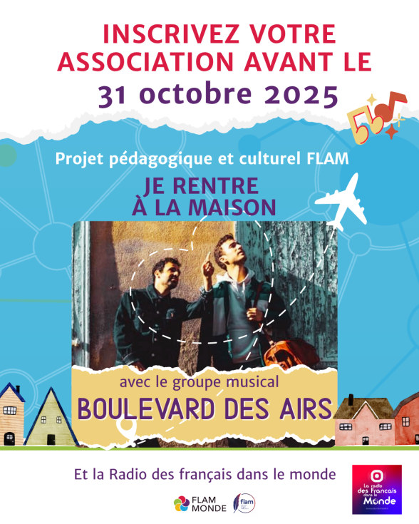 La Fédération FLAM Monde propose à l’ensemble de ses associations adhérentes de participer à un projet culturel inédit, en partenariat avec le groupe Boulevard des Airs et la Radio des Français dans le Monde. Intitulé « Je rentre à la maison », ce projet artistique et pédagogique s’appuie sur la chanson du même nom pour inviter les élèves à explorer, par la création, la notion de « maison » : un lieu réel ou symbolique, une langue, un souvenir, un lien affectif ou un ancrage personnel.