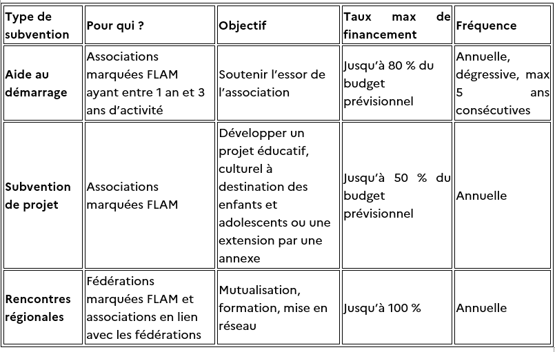 Une association ayant la marque FLAM peut déposer au maximum 3 dossiers par campagne FLAM, un dossier pour chaque type de subvention.